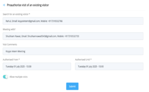 Pre -Authorised visits refer to situations where you already got  approval for receiving certain services/meetings.Koyyo provides you with the feature to schedule pre-authorised meetings of the visitors with staff members, manager, or any authority.